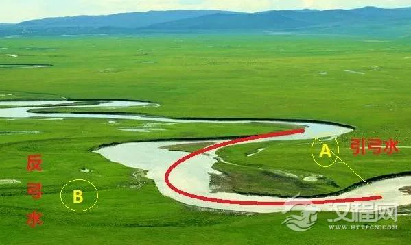 如上图所示,一条河流蜿蜒而行,构成了无数的大大小小的弓形,在标红色线处亦为一把虚拟的弓形。当我们站在A岸以及其弓弦后部时,我们的前方就是一