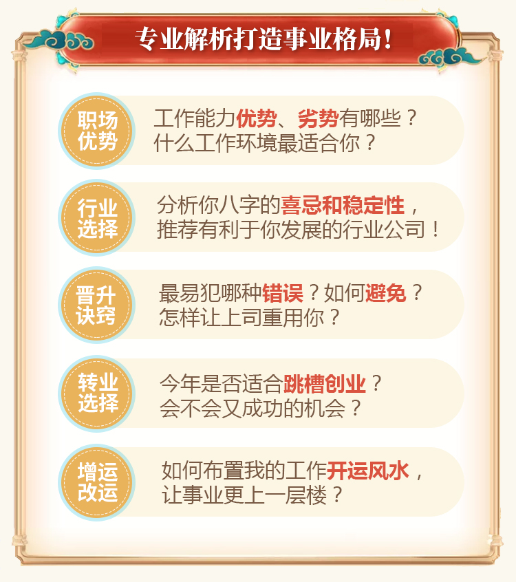 想让自己在事业上更上一层楼,但又找不到很好的突破口,这个测算正合我心意,我想看到的内容里面都有提到,而且很详细,还给了我一些不错的建议,很满意哦