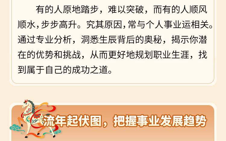 的动态分析,把星象学复杂的理论转化成易懂而专业的解读,让你轻松掌握流年事业走势,窥探事业工作变化。此外,还为个人
