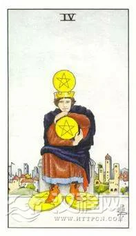 星币四中,坐着一位房东,后面是他的房子,也是他的收入来源,是他的收入基础,所以抽到这副牌,代表是有经济基础的,有实力的,小土财主。图中的人物手环抱着星币,看似怪异的手部姿势是太极运转的图形,也是代表金钱不断的产生,收入不断的增加,而手、头部与脚步都要持有星币,牢牢地抓住金钱,是一种封闭的姿势,也就是说,他的钱是只进不出的,财富不断的累积,不断的增长。储蓄是他的理财观点,记帐是他